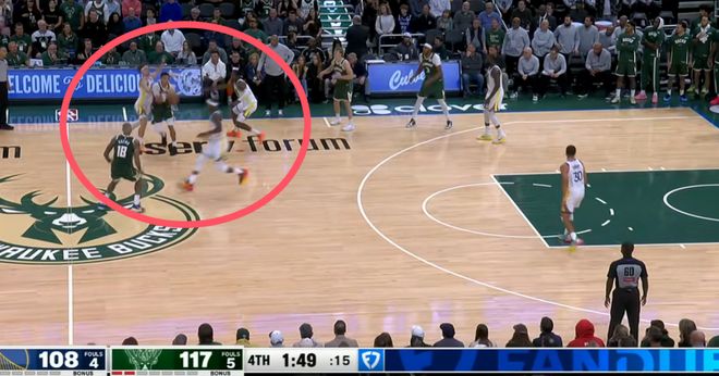 夸张到什么程度?第4节他已经把勇士打得在中圈附近双人夹击了,三个人上来对着他,就这种防守待遇我们只在库里身上见过,现在直接回到了勇士队对手的身上,可是罗林斯就这样也不慌。先是面对霍福德的防守,在2分07秒的时候单挑老霍急停中投轰进,打得像亚历山大。