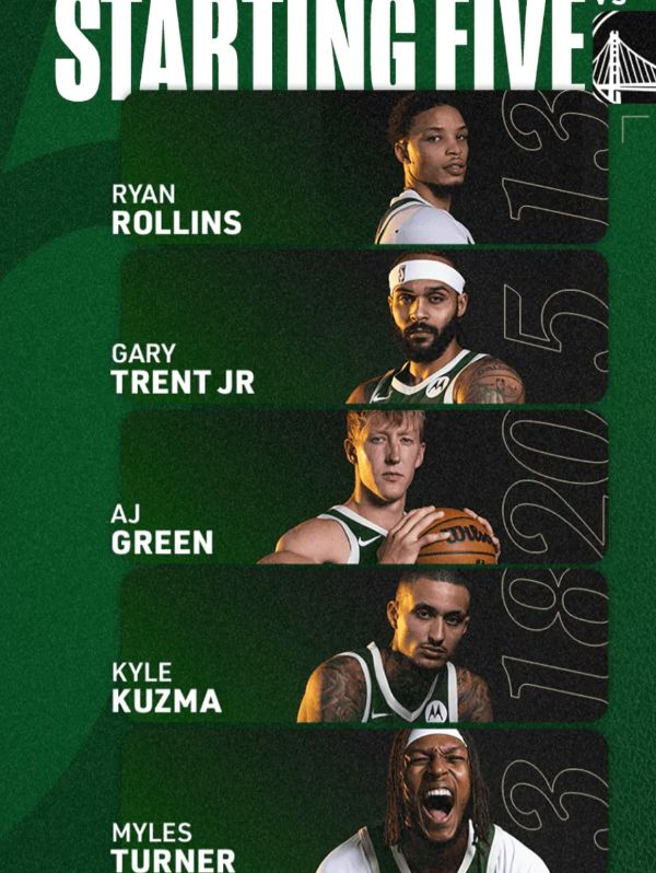 首发阵容方面,勇士队这边,科尔排出的最新首发五人组为:斯蒂芬-库里、吉米-巴特勒、乔纳森-库明加、德雷蒙德-格林、昆滕-波斯特;雄鹿队这边,首发阵容则为:莱恩-罗林斯、 小加里-特伦特、AJ-格林、凯尔-库兹马和迈尔斯-特纳。