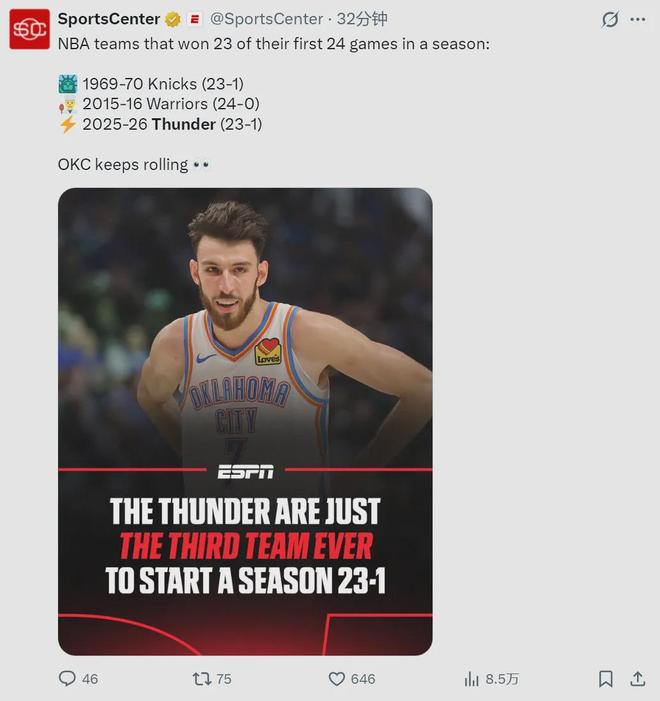 雷霆23胜1负追平1969-70赛季的尼克斯,NBA开季24场的历史第二战绩。雷霆接下来10个对手分别是:太阳、快船、森林狼、灰熊、马刺(连打两场)、76人、老鹰、开拓者和勇士。只要雷霆正常发挥,25连胜并非遥不可及。