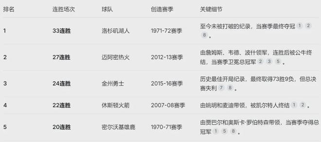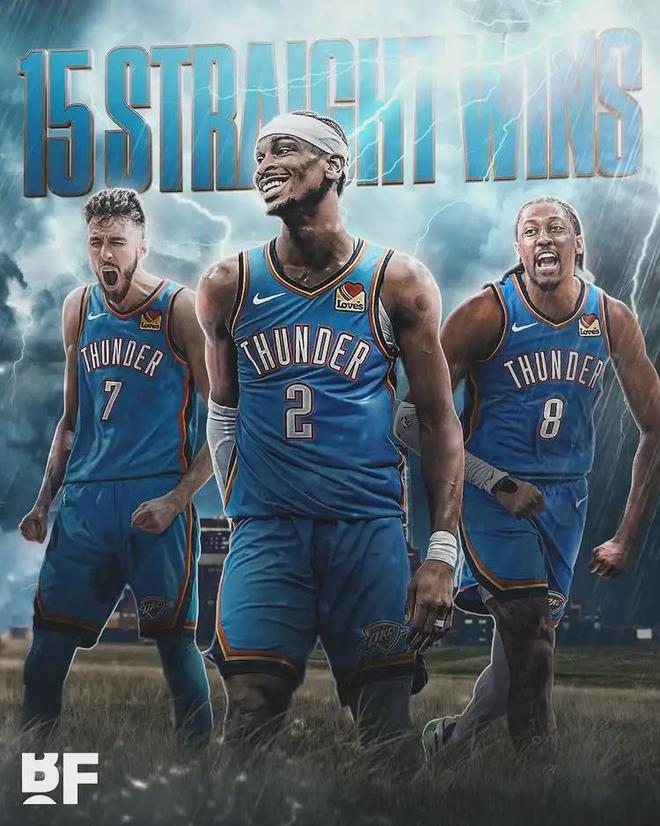 单季15连胜,追平雷霆队史纪录。NBA单赛季最长连胜,是湖人在1971-72赛季创造的33连胜。历史第二是2012-13赛季热火的27连胜,历史第三就是2015-16赛季勇士的24连胜(开季),第四是2007-08赛季火箭的22连胜。